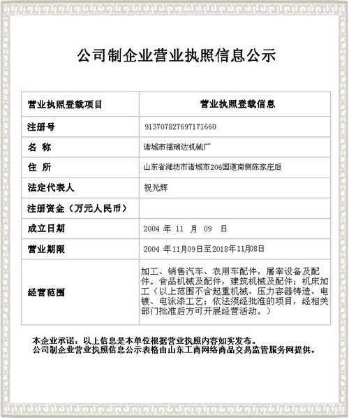 • 公司簡介      諸城市福瑞達機械有限公司 是一家專業(yè)開發(fā)設計,生產制造畜禽屠宰設備的私營企業(yè).位于山東省諸城市龍都工業(yè)園,緊靠206國道,膠新鐵路,交通十分便利.       我廠現有中,高級技術人員數名,有多年的設計與制造畜禽宰殺機械的理論和經驗.可根據客戶的要求進行前期的工藝設計及流程布局,中期的設備安裝與調試,以及后期的售... [詳細內容]